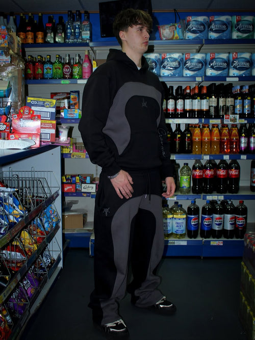 A deep black foundation sets the tone, contrasted by anthracite grey panels that sculpt the body and emphasize motion. Every line, every cut is intentional, shaping a look that balances relaxed ease with a strong, grounded presence.
